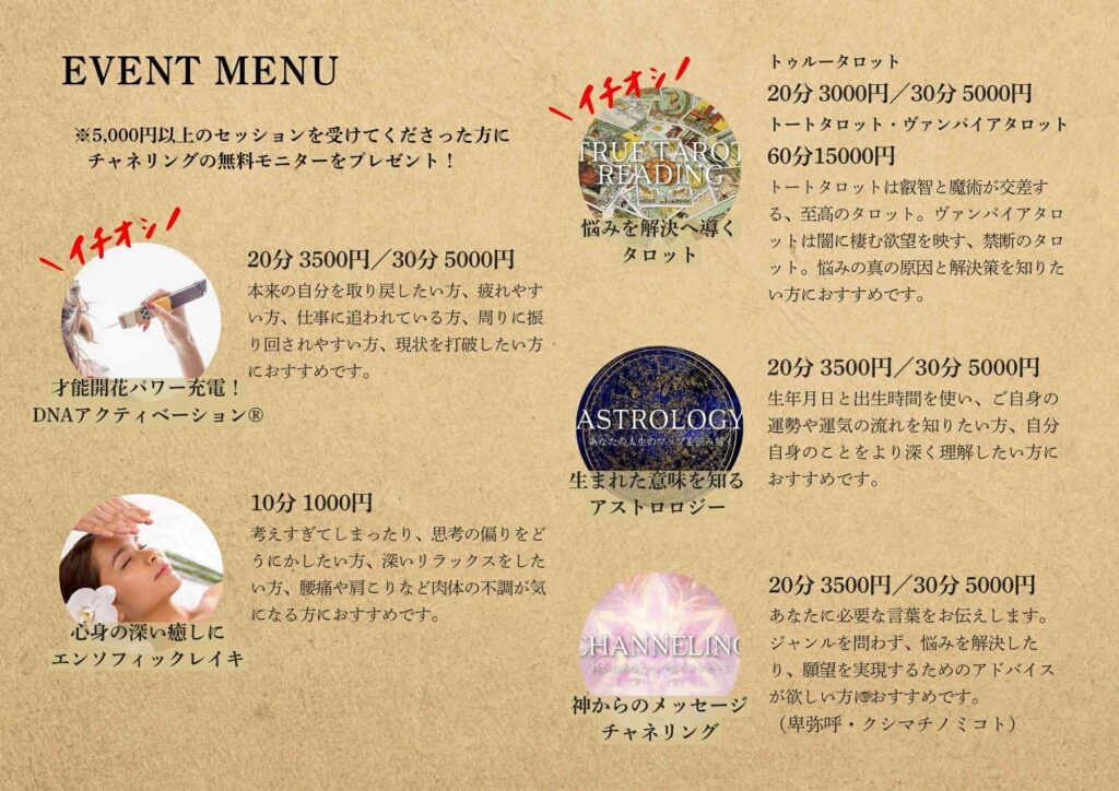 ※赤字メニューは事前予約時に生年月日等入れていただくと、鑑定シートプレゼントとなります。